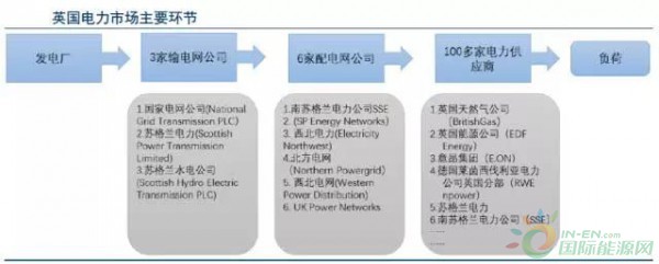 整個英國由3家輸電網(wǎng)公司負責區(qū)域性輸電網(wǎng)絡(luò)。在配電網(wǎng)層面,英國被劃分為14個區(qū)域并由6大配電網(wǎng)公司(DNOs)運營。配電公司作為獨立于輸電和售電環(huán)節(jié)的中間人,通過運作其擁有的配電網(wǎng)絡(luò)將輸電網(wǎng)傳輸?shù)碾娏Ψ峙浣o民用和工商業(yè)用戶。但是配電公司并不參與售電的環(huán)節(jié)。與發(fā)電、輸電和配電公司不同的是,英國電力供應(yīng)商被定義為支付配電網(wǎng)絡(luò)費用并從電力批發(fā)市場中購買電力,再以一定價格出售給自己顧客的商業(yè)實體。
