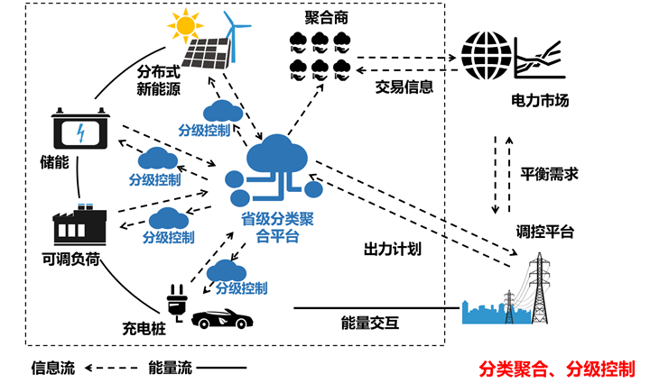 (十五)推動源網(wǎng)荷儲電力資源分類分級聚合?;诮y(tǒng)一的數(shù)字底座、物聯(lián)采集與實時量測中心等技術(shù)架構(gòu),建立和完善省級源網(wǎng)荷儲分類聚合平臺,通過統(tǒng)一平臺對源網(wǎng)荷儲四側(cè)資源分散聚合控制,實現(xiàn)電力系統(tǒng)分層分級的綜合動態(tài)平衡。開展源網(wǎng)荷儲分類分級聚合頂層設(shè)計,研究制定分類分級聚合的技術(shù)路徑和實施方案。推動分布式光伏運營監(jiān)測平臺、配電監(jiān)控系統(tǒng)的升級改造和分級應(yīng)用,實現(xiàn)對分布式光伏的“剛性控”“柔性控”“群調(diào)群控”等多場景靈活控制。完善常規(guī)中小電源聚合平臺,調(diào)動中小電源深度聚合的積極性,提升中小電源統(tǒng)一調(diào)度能力,實現(xiàn)廣域協(xié)同、靈活互動。深化建設(shè)新型負(fù)荷管理平臺,提升新型負(fù)荷管理系統(tǒng)智能化、實用化水平,對負(fù)荷資源分層分類統(tǒng)一管理、統(tǒng)一調(diào)控、統(tǒng)一服務(wù)。建設(shè)用戶側(cè)儲能監(jiān)控平臺,分級分類接入用戶側(cè)儲能電站數(shù)據(jù),實現(xiàn)海量用戶側(cè)儲能資源更大范圍的共享互濟和優(yōu)化配置。建立適應(yīng)源網(wǎng)荷儲分類分級聚合的調(diào)度模式和交易機制,貫穿省、市、縣三級調(diào)度系統(tǒng),制定并網(wǎng)管理、運行控制相關(guān)標(biāo)準(zhǔn)規(guī)范,完善清潔能源、需求側(cè)資源和儲能參與電力市場的機制,依托統(tǒng)一的信息共享和技術(shù)支持平臺,培育多類型聚合商參與分層分級聚合調(diào)度。構(gòu)建基于電網(wǎng)一張圖的新型電力系統(tǒng)全要素數(shù)字底座,開展新型電力系統(tǒng)各要素承載力的可視化推演計算,實現(xiàn)配網(wǎng)各環(huán)節(jié)、各業(yè)務(wù)以及新要素的全面圖上管控,提升分布式資源消納能力。