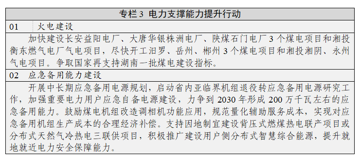 (八)提升電力應(yīng)急備用能力。加強極端形勢下電力風(fēng)險管控,做好應(yīng)對自然災(zāi)害、尖峰負(fù)荷、大面積停電、電網(wǎng)攻擊等情況的保供預(yù)案,提高應(yīng)急處置和抗災(zāi)能力。開展中長期應(yīng)急備用電源規(guī)劃,按照最大負(fù)荷3%—4%疊加新能源裝機容量1%—3%標(biāo)準(zhǔn)配置應(yīng)急備用電源規(guī)模。落實國家應(yīng)急備用電源管理要求,科學(xué)認(rèn)定和退出應(yīng)急備用機組,對符合能效、環(huán)保、安全等政策和標(biāo)準(zhǔn)要求的退役火電機組,按照“關(guān)而不拆”原則轉(zhuǎn)為應(yīng)急備用電源,做好設(shè)備維護和燃料供應(yīng)保障。支持分布式天然氣發(fā)電項目建設(shè),在有規(guī)模熱(冷)負(fù)荷的工業(yè)園區(qū)、經(jīng)濟開發(fā)區(qū)、空港新區(qū)等區(qū)域,因地制宜建設(shè)背壓式燃煤熱電聯(lián)產(chǎn)項目或分布式天然氣冷熱電三聯(lián)供項目,積極推廣建設(shè)用戶側(cè)分布式智慧綜合能源,提升就地就近電力安全保障能力。加強政府、醫(yī)院、鐵路、民航等重要電力用戶應(yīng)急自備電源建設(shè),力爭實現(xiàn)應(yīng)配盡配全面覆蓋,電源容量應(yīng)滿足全部保安負(fù)荷需求。加強抽水蓄能電站應(yīng)急備用能力建設(shè),推動抽水蓄能電站具備黑啟動功能。做好一次能源監(jiān)測預(yù)警和供應(yīng)協(xié)調(diào),提升電源發(fā)電能力,利用負(fù)荷和電源的時空互補特性,有效提高湖南與其他區(qū)域間電力互補互濟、調(diào)劑余缺能力。