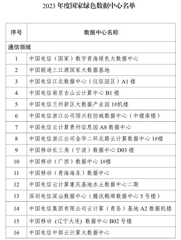 2024年第12號按照《工業(yè)和信息化部辦公廳 國家發(fā)展改革委辦公廳 商務(wù)部辦公廳 國管局辦公室 金融監(jiān)管總局辦公廳 國家能源局綜合司關(guān)于組織開展2023年度國家綠色數(shù)據(jù)中心推薦工作的通知》(工信廳聯(lián)節(jié)函﹝2023﹞341號)要求,經(jīng)地方推薦、專家評審、社會公示等程序,現(xiàn)將2023年度50家國家綠色數(shù)據(jù)中心名單予以公告。