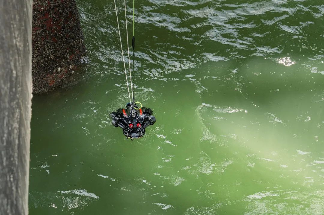 ▲水下智能巡檢機器人可對海上架空輸電線路樁基礎進行探傷檢測和可見光巡查。(黃海鵬 攝)
