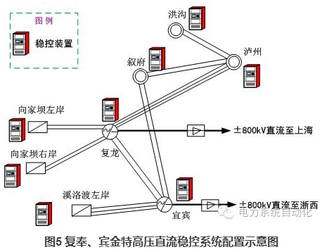 隨著多個特高壓交直流輸電通道的建成投產(chǎn),控制策略的設(shè)計和制定面臨新的要求,尤其體現(xiàn)在多個穩(wěn)控系統(tǒng)和控制策略間的協(xié)調(diào)控制方面。以復(fù)奉直流、賓金直流為例,為了解決兩大特高壓直流送出的穩(wěn)定問題,在復(fù)龍換流站、宜賓換流站、溪洛渡電廠等8個廠站配置了安全穩(wěn)定控制裝置,如圖5所示。經(jīng)計算,兩大直流故障后均可能會切除向左、向右以及溪左三個電廠的機(jī)組,兩個穩(wěn)控系統(tǒng)之間的控制措施有重疊。若按傳統(tǒng)的思路制定策略和實施方案,兩套穩(wěn)控系統(tǒng)間無信息交互和協(xié)調(diào),當(dāng)出現(xiàn)兩大直流同時雙極閉鎖的極端故障時,某些機(jī)組會同時被兩個主站發(fā)來的命令切除,從而導(dǎo)致控制措施量不足。