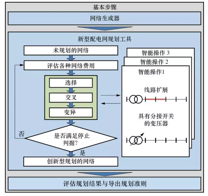 文獻(xiàn)[18]針對中、低壓配網(wǎng)提出一種基于遺傳算法(geneticalgorithm,GA)的規(guī)劃方法,如圖6所示。第一步,根據(jù)不同的供用電要求以及實際電網(wǎng)特征,生成特征各異的網(wǎng)絡(luò)結(jié)構(gòu);第二步,利用GA方法針對每種網(wǎng)絡(luò)結(jié)構(gòu)得到最優(yōu)的傳統(tǒng)建設(shè)方案和智能建設(shè)方案;最后,對所得方案進(jìn)行評估比較。運(yùn)用GA算法時,每種符合運(yùn)行約束要求的電網(wǎng)配置方案都作為一個個體,每次迭代時,以各種網(wǎng)絡(luò)成本(適應(yīng)度函數(shù))最小為目標(biāo),先隨機(jī)挑選兩個個體進(jìn)行交叉生成新個體,然后以減小成本為原則修改個體(變異),變異后計算潮流以驗證網(wǎng)絡(luò)約束是否越限,如果越限,則通過擴(kuò)建線路等措施修改個體,或回退到變異之前的初始狀態(tài);此過程不斷繼續(xù),直到滿足收斂判據(jù)。另外,該方法還采用了所謂智能操作(smartoperator)來改善GA求解效率不高的缺陷,即利用一些有效措施(如中低壓變壓器分接頭切換和線路擴(kuò)建相結(jié)合)對當(dāng)前結(jié)果進(jìn)行智能化修正,加速找到最優(yōu)解的過程。