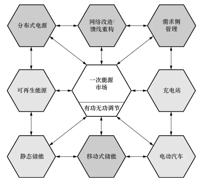 為了輔助智能電網(wǎng)規(guī)劃人員確保系統(tǒng)運(yùn)行的安全性,可靠性以及供電質(zhì)量,需要開發(fā)綜合全面的新工具。文獻(xiàn)[16]通過對智能技術(shù)及其交互方式進(jìn)行分類,設(shè)計了一個專為智能電網(wǎng)規(guī)劃人員量身定做的工具箱架構(gòu)(如圖5所示)。規(guī)劃人員在確定電網(wǎng)建設(shè)和饋線重構(gòu)方案時,并非像傳統(tǒng)做法那樣只考慮峰荷,而是同時考慮分布式電源(DG)、移動式存儲和需求側(cè)管理(DSM),這樣得到的方案更具成本效益。通過可再生能源和靜態(tài)儲能相互配合可以削峰填谷,增加網(wǎng)絡(luò)容量;充電站的電動汽車耗電量受實時電價變化的影響,因此可作為DSM的一部分;各類儲能設(shè)備可被用來提升電能質(zhì)量,因此可被視為有功/無功功率源;一次能源市場運(yùn)行人員在擁有發(fā)電和儲能資源的輸配電運(yùn)行人員之間進(jìn)行協(xié)調(diào)優(yōu)化,得到實時電價,通過AMI提供給用戶。此工具箱的理念和結(jié)構(gòu)尚未成熟,還需在未來的研究工作中進(jìn)一步完善。