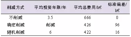 由于規(guī)劃周期較長,考慮了未來峰荷發(fā)展和DG接入容量的變電站規(guī)劃面臨很大的不確定性和投資風(fēng)險,所以必須進(jìn)行風(fēng)險評估。文獻(xiàn)[7]在相同功率約束條件下,對投資變電站和削減配電側(cè)DG發(fā)電出力兩種技術(shù)方案進(jìn)行了比較,給出了優(yōu)化的折中方法。該文獻(xiàn)以30MW變電站接入不同光伏容量(0、1、9.5MW)的情形為例,對各種削減模式下延緩?fù)顿Y的效果進(jìn)行了比較,結(jié)果如表2所示,與不削減DG容量相比,采用確定(定時)削減方式,投資年限可延緩3.4年,投資費(fèi)用可減少9.6萬歐元;采用隨機(jī)削減方式,投資年限則可延緩2.5年、投資費(fèi)用可減少1.6萬歐元。因為實際參數(shù)的隨機(jī)特性會影響計算結(jié)果,所以真正的延緩?fù)顿Y效果主要取決于預(yù)測模型的精度。