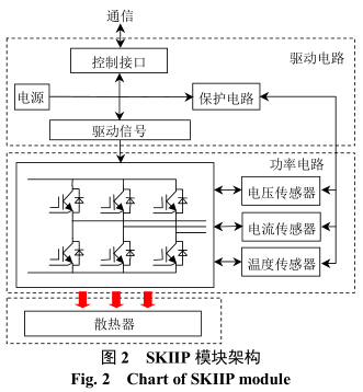 賽米控智能集成功率(Semikron integrated intel-ligent power,SKIIP)模塊[6]集成了功率半導(dǎo)體器件、散熱器以及具有保護(hù)和監(jiān)測(cè)電路的門極驅(qū)動(dòng)電路,并具有用于短路和過電流保護(hù)的閉環(huán)電流傳感器,同時(shí)還集成了溫度傳感器。采用SKIIP模塊[6]可以大大簡(jiǎn)化逆變器主電路,提高系統(tǒng)的抗干擾能力,該模塊具有標(biāo)準(zhǔn)接口,其架構(gòu)如圖2所示。