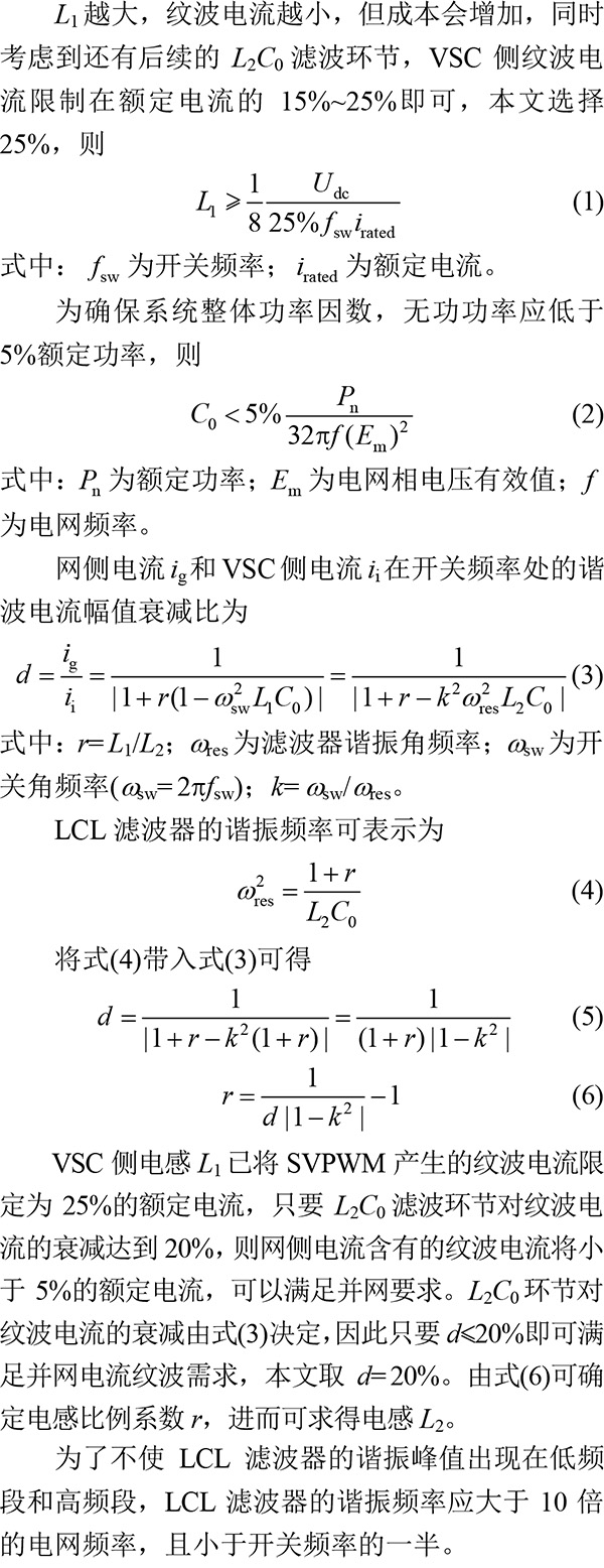 相對(duì)于傳統(tǒng)的單電感濾波器,3階LCL濾波器能更好地抑制并網(wǎng)變換器引起的電流諧波。LCL濾波器的參數(shù)對(duì)系統(tǒng)的動(dòng)態(tài)及穩(wěn)態(tài)性能影響很大,文獻(xiàn)[7]對(duì)LCL濾波器參數(shù)的限制條件以及設(shè)計(jì)步驟做了詳細(xì)介紹,本文在此基礎(chǔ)上確定LCL濾波器的參數(shù)。根據(jù)VSC側(cè)電流最大允許紋波得到VSC側(cè)電感L1的最小值,根據(jù)系統(tǒng)的無功功率限定值求得濾波電容C0,最后根據(jù)并網(wǎng)電流總諧波得到網(wǎng)側(cè)電感L2。