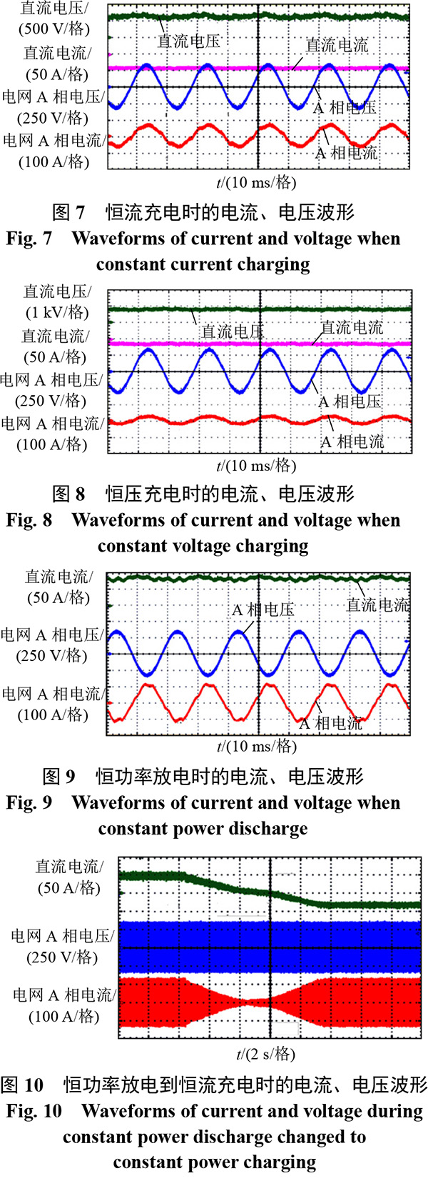 利用本文儲(chǔ)能并網(wǎng)變換器實(shí)現(xiàn)方案研制了試驗(yàn)樣機(jī),并進(jìn)行了鋰電池儲(chǔ)能系統(tǒng)充放電測(cè)試,具體試驗(yàn)內(nèi)容為恒流充電、恒壓充電、恒功率放電以及由充電到放電的過渡。