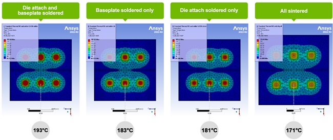 有關(guān)于同工況下,使用芯片下及系統(tǒng)級燒結(jié)銀連接方案,將會比單單在芯片下使用燒結(jié)銀方案,系統(tǒng)溫度將下降約10℃。比全軟焊料解決方案下降更多,能達(dá)到約20℃的顯著效果。