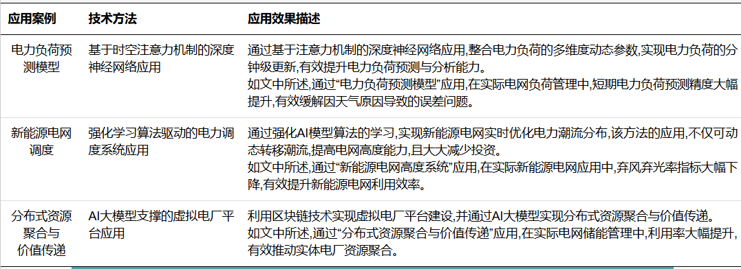 傳統(tǒng)的電力系統(tǒng)供需匹配存在發(fā)電慣性大、儲能能力不足、調(diào)峰能力有限、跨區(qū)域調(diào)配壁壘等問題,在大模型技術(shù)支撐下電力系統(tǒng)供需匹配的復(fù)雜性得到系統(tǒng)性突破?;跁r(shí)空注意力機(jī)制(指在時(shí)間和空間維度上對輸入數(shù)據(jù)進(jìn)行自適應(yīng)處理的方法)的深度神經(jīng)網(wǎng)絡(luò),整合用戶側(cè)用電數(shù)據(jù)、分布式能源+儲能、電力市場交易信息等多維度動(dòng)態(tài)參數(shù),構(gòu)建起分鐘級更新的負(fù)荷預(yù)測模型。筆者根據(jù)《國家電網(wǎng)報(bào)》的數(shù)據(jù)統(tǒng)計(jì)得出:2024年,在華東某省級電網(wǎng)的實(shí)測中,基于智能電網(wǎng)的AI大模型預(yù)測電網(wǎng)負(fù)荷,全網(wǎng)平均負(fù)荷預(yù)測準(zhǔn)確率達(dá)98.49%,日最高負(fù)荷預(yù)測準(zhǔn)確率達(dá)99.08%,數(shù)據(jù)收集工作時(shí)長從30 min縮短至2 min,有效緩解傳統(tǒng)預(yù)測方法因天氣突變導(dǎo)致的誤差放大問題;針對高比例新能源接入的電網(wǎng),強(qiáng)化學(xué)習(xí)算法驅(qū)動(dòng)的調(diào)度系統(tǒng)實(shí)時(shí)優(yōu)化電力潮流分布,在西北某新能源基地的應(yīng)用案例中,棄風(fēng)棄光率(指在一定時(shí)間內(nèi),因各種原因?qū)е碌娘L(fēng)電和光伏發(fā)電未能被充分利用的比例)從12.6%降至3.8%,分布式潮流控制裝置總?cè)萘繛?.8萬kVA,可動(dòng)態(tài)轉(zhuǎn)移潮流10萬kW;大模型支撐的虛擬電廠平臺聚合海量分布式資源,通過區(qū)塊鏈技術(shù)實(shí)現(xiàn)價(jià)值傳遞,在國家電網(wǎng)廣東省試點(diǎn)項(xiàng)目中,用戶側(cè)儲能系統(tǒng)的利用率提升60%,需求響應(yīng)參與度達(dá)到83%,通過智能化的供需協(xié)同機(jī)制與AI大模型的深度應(yīng)用(如表2所示),推動(dòng)電力系統(tǒng)向“源網(wǎng)荷儲”深度互動(dòng)的新型模式演進(jìn)[3]。同時(shí),為避免單一數(shù)據(jù)源出現(xiàn)信息失真,國家電網(wǎng)通過AI大模型對溫度、濕度、風(fēng)速等主要參數(shù)進(jìn)行三重校驗(yàn)與交叉驗(yàn)證,有效避免數(shù)據(jù)誤差造成預(yù)測失真的問題。