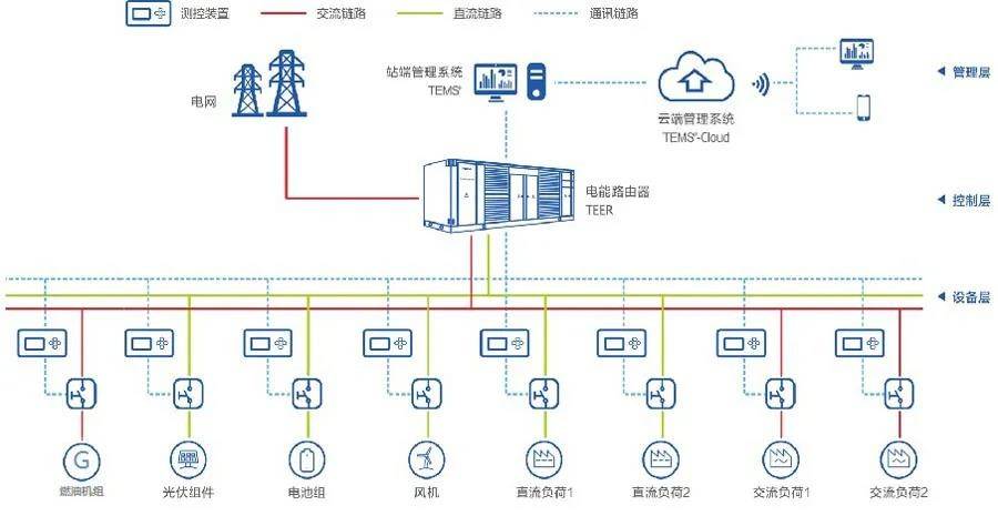 基于電力電子變壓器的交直流混合微網(wǎng)系統(tǒng)總體可分為三層架構(gòu)。第一層為設(shè)備層,主要囊括了分布式電源(風(fēng)電、光伏系統(tǒng)等)和不同的交直流負(fù)荷;第二層控制層,以電力電子變壓器為核心,分布式電源和負(fù)荷可通過(guò)其靈活的多端口配置實(shí)現(xiàn)可靠接入,并通過(guò)其中/高壓接口,實(shí)現(xiàn)與配電網(wǎng)的有效連接;第三層為管理層,以“雙端”能量管理系統(tǒng)為核心,采用人工智能算法可實(shí)現(xiàn)電力電子變壓器交直流混合系統(tǒng)的分布式能源互補(bǔ)優(yōu)化以及多個(gè)端口之間的協(xié)調(diào)控制,提高能源利用效率,多機(jī)并聯(lián)系統(tǒng)的集群控制、功率在線優(yōu)化分配,保障系統(tǒng)效率最優(yōu),同時(shí)能夠?qū)与娋W(wǎng)調(diào)度,參與電力市場(chǎng)交易及輔助服務(wù)等,真正實(shí)現(xiàn)綠色數(shù)據(jù)中心電能的智能路由。
