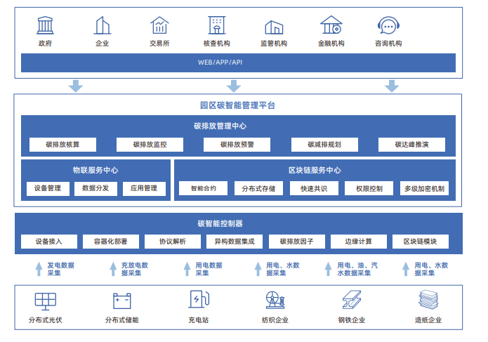 江行智能工業(yè)園區(qū)“雙碳”管理方案以雙碳目標(biāo)為引領(lǐng),以園區(qū)能源流和碳流監(jiān)控管理為基礎(chǔ),以綠色節(jié)能降碳和產(chǎn)業(yè)經(jīng)濟(jì)服務(wù)為核心,以數(shù)據(jù)為驅(qū)動(dòng),構(gòu)建工業(yè)園區(qū)碳智能管理平臺(tái),部署具備區(qū)塊鏈分布式賬本的碳智能控制器,在數(shù)據(jù)采集源頭保證碳排放數(shù)據(jù)的安全、可信和不可篡改,精準(zhǔn)有效開(kāi)展園區(qū)碳排放監(jiān)管。