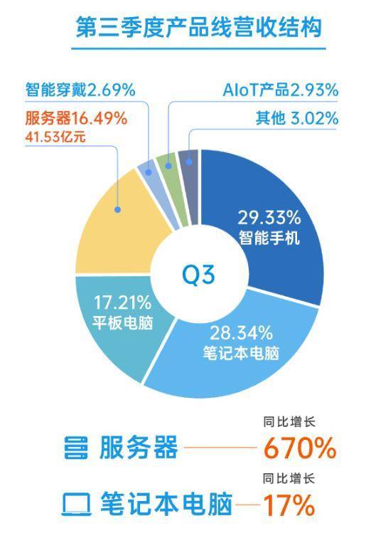 其中,公司筆電業(yè)務(wù)、服務(wù)器市場持續(xù)突破,均實現(xiàn)了顯著增長。2023年第三季度公司服務(wù)器市場實現(xiàn)營業(yè)收入41.53億元,同比增長670%;筆電業(yè)務(wù)同比增長17%。