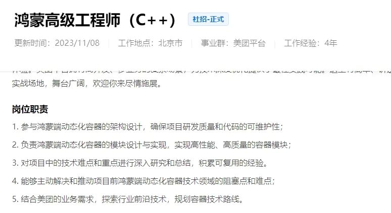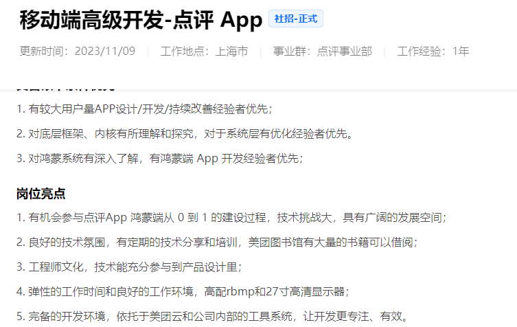 美團(tuán)發(fā)布了鴻蒙高級(jí)工程師、鴻蒙基建工程師等多個(gè)鴻蒙開發(fā)相關(guān)崗位。主要開發(fā)美團(tuán)鴻蒙App、大眾點(diǎn)評(píng)鴻蒙App。網(wǎng)易更新了高級(jí)/資深A(yù)ndroid 開發(fā)工程師崗位,職位要求參與云音樂(lè)多端多OS的產(chǎn)品(Android、鴻蒙等)研發(fā)迭代。