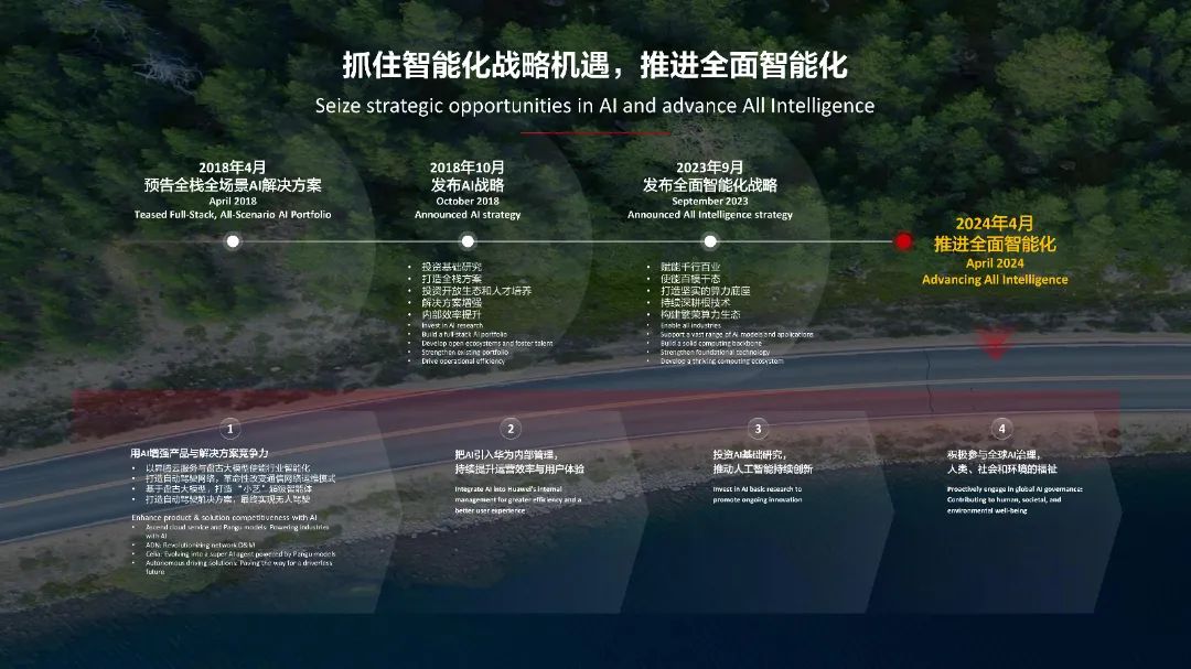? 第五個(gè)舉措,也是今天要重點(diǎn)闡述的,華為如何抓住智能化戰(zhàn)略機(jī)遇,推進(jìn)全面智能化。華為公司的AI戰(zhàn)略以及全棧全場(chǎng)景AI解決方案是在2018年4月的分析師大會(huì)向大家預(yù)告的,并在2018年10月的全聯(lián)接大會(huì)正式發(fā)布的。在2023年9月的全聯(lián)接大會(huì)上,華為進(jìn)一步發(fā)布了全面智能化的戰(zhàn)略,今天我將更具體地闡述華為如何來(lái)全面推進(jìn)智能化。