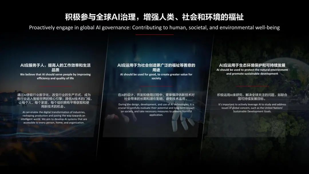 我們認(rèn)為AI應(yīng)服務(wù)于人,提高人的工作效率和生活品質(zhì),通過(guò)AI使能行業(yè)數(shù)字化,改變行業(yè)的生產(chǎn)方式,成為各行業(yè)進(jìn)入智能世界的核心引擎;要持續(xù)降低AI的技術(shù)門檻,讓每個(gè)人、每個(gè)家庭、每個(gè)組織擁有平等獲取和使用新技術(shù)的機(jī)會(huì)。同時(shí),AI應(yīng)運(yùn)用于為社會(huì)創(chuàng)造更廣泛的福祉等善意的用途,在AI的設(shè)計(jì)、開發(fā)和使用過(guò)程中,要審慎評(píng)估新技術(shù)對(duì)社會(huì)帶來(lái)的長(zhǎng)期和潛在影響,避免技術(shù)濫用。以及,AI應(yīng)運(yùn)用于生態(tài)環(huán)境保護(hù)和可持續(xù)發(fā)展,積極運(yùn)用AI來(lái)研究、解決全球關(guān)注的問(wèn)題,如聯(lián)合國(guó)可持續(xù)發(fā)展目標(biāo)。