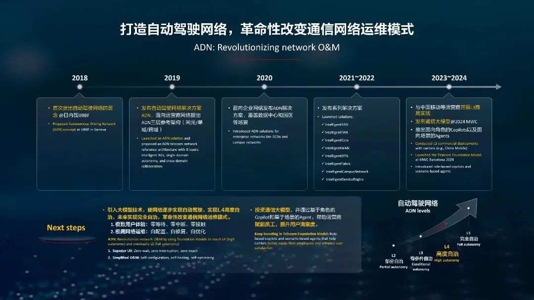 ? 打造自動(dòng)駕駛網(wǎng)絡(luò),革命性改變通信網(wǎng)絡(luò)運(yùn)維模式。電信運(yùn)營(yíng)商網(wǎng)絡(luò)運(yùn)維是非常復(fù)雜的,因此成本也非常高。因此在2018年的日內(nèi)瓦UBBF,華為參考汽車自動(dòng)駕駛的分級(jí)理念提出了自動(dòng)駕駛網(wǎng)絡(luò)的概念,也就是ADN(Autonomous Driving Network)。經(jīng)過(guò)這么多年和電信運(yùn)營(yíng)商持續(xù)的探討、聯(lián)合創(chuàng)新,形成了大量的ADN解決方案,到今天,ADN已經(jīng)成為網(wǎng)絡(luò)運(yùn)維智能化轉(zhuǎn)型的戰(zhàn)略共識(shí)。而大模型出來(lái)以后,自動(dòng)駕駛網(wǎng)絡(luò)的目標(biāo)更加具有現(xiàn)實(shí)意義了,運(yùn)營(yíng)商都希望自己的網(wǎng)絡(luò)能夠盡快實(shí)現(xiàn)自動(dòng)駕駛、實(shí)現(xiàn)L4高度自治,未來(lái)實(shí)現(xiàn)完全自治,帶來(lái)以“零等待、零中斷、零接觸”為標(biāo)志的極致的用戶體驗(yàn),和以“自配置、自修復(fù)、自優(yōu)化”為標(biāo)志的極簡(jiǎn)的網(wǎng)絡(luò)運(yùn)維。華為將與中國(guó)及全球運(yùn)營(yíng)商合作打造通信大模型,并首先通過(guò)基于角色的Copilot和基于場(chǎng)景的Agent,幫助運(yùn)營(yíng)商賦能員工,提升用戶滿意度,讓運(yùn)營(yíng)商盡快因大模型技術(shù)和自動(dòng)駕駛網(wǎng)絡(luò)而獲益。