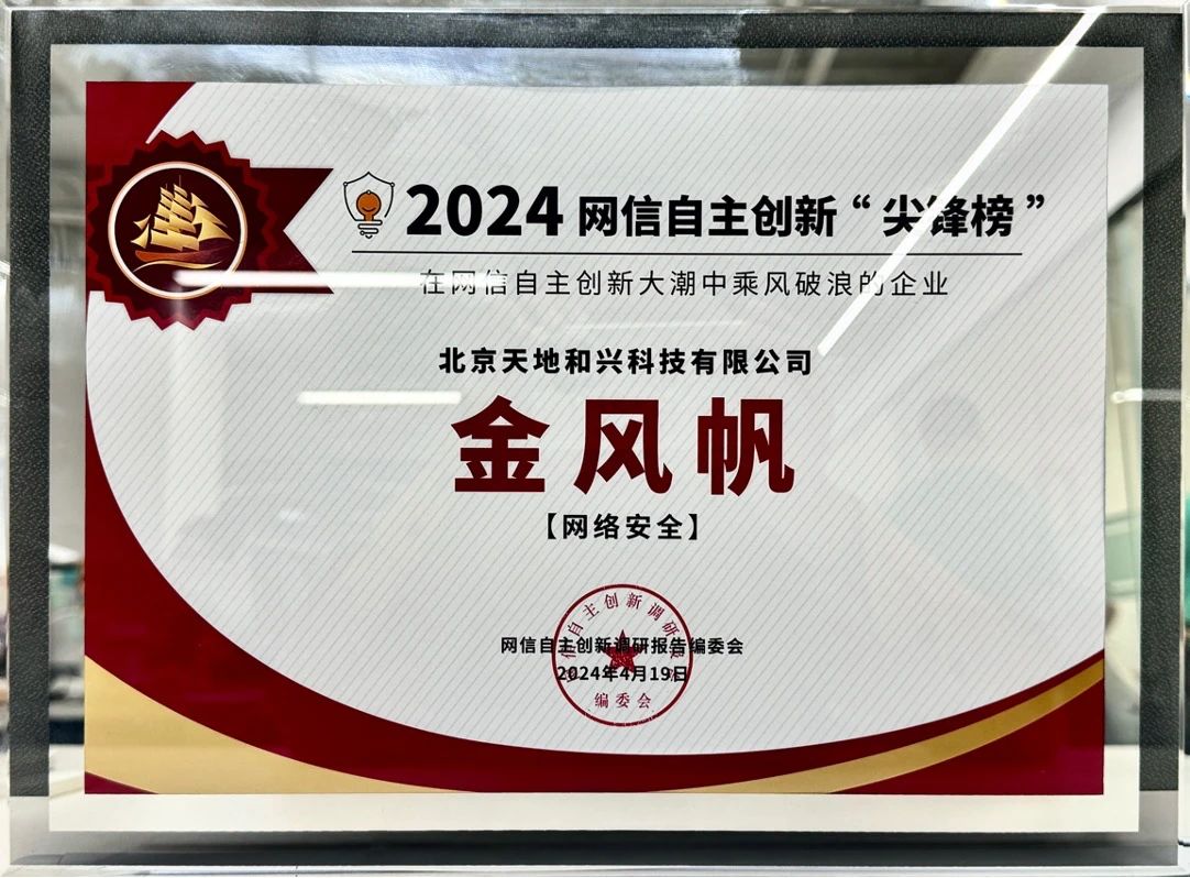 在報告發(fā)布之際,報告編委會推選了具有突出創(chuàng)新能力、取得顯著創(chuàng)新成果、能夠代表創(chuàng)新水平、做出卓越創(chuàng)新貢獻的企業(yè)等予以表彰。天地和興作為在網(wǎng)信自主創(chuàng)新大潮中乘風(fēng)破浪的企業(yè),被授予2024網(wǎng)信自主創(chuàng)新尖鋒榜“金風(fēng)帆獎”。