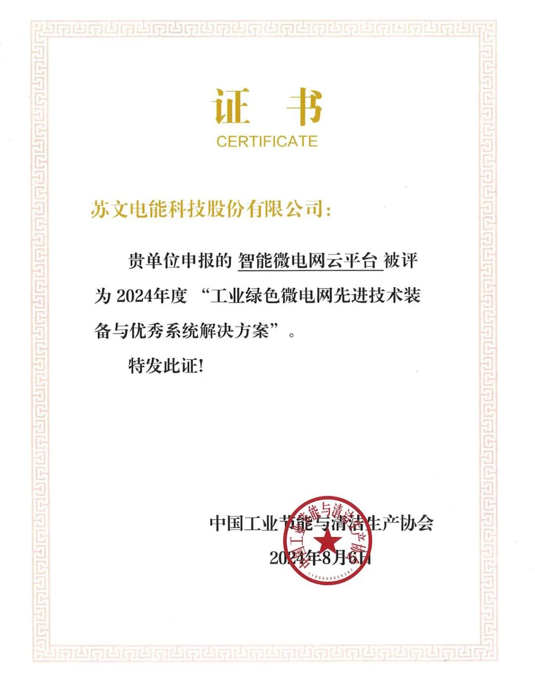 8月17日,由中國工業(yè)節(jié)能與清潔生產(chǎn)協(xié)會(huì)主辦的“2024工業(yè)綜合能效大會(huì)”順利召開,蘇文電能(300982)電能俠智能微電網(wǎng)云平臺(tái)被授予“工業(yè)綠色微電網(wǎng)先進(jìn)技術(shù)裝備與優(yōu)秀系統(tǒng)解決方案”大獎(jiǎng),這一榮譽(yù)標(biāo)志著,蘇文電能在工業(yè)節(jié)能環(huán)保領(lǐng)域所作出的突出貢獻(xiàn)。
