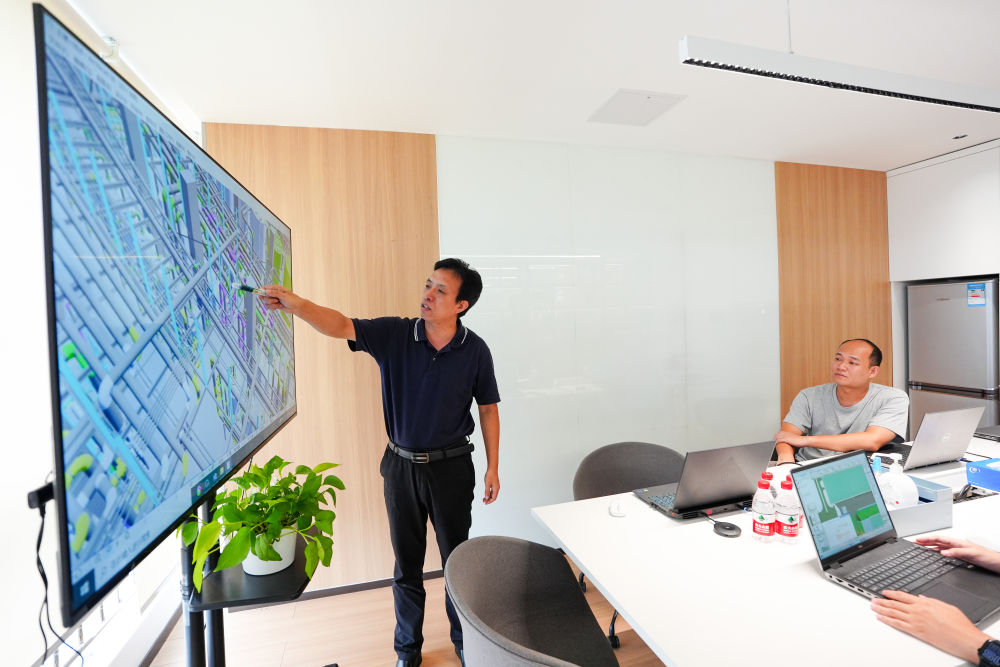 2024年8月26日,中國(guó)電子院工作人員利用數(shù)字孿生模型討論某半導(dǎo)體項(xiàng)目純水系統(tǒng)方案