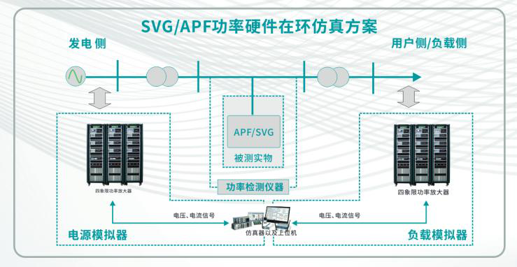 SVG/APF功率硬件在環(huán)仿真方案:在新型電力系統(tǒng)應用場景中,PAS放大器與仿真器的結(jié)合,能夠?qū)Πl(fā)電側(cè)和負載側(cè)進行數(shù)字化模擬,結(jié)合功率檢測儀的實測數(shù)據(jù),通過數(shù)據(jù)采集系統(tǒng),可實現(xiàn)以APF,SVG為被測設(shè)備的半實物功率硬件在環(huán)仿真測試。