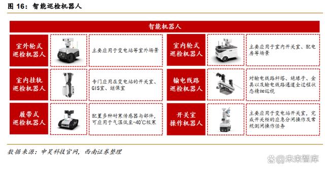 巡檢是保障電網(wǎng)穩(wěn)定性的重要環(huán)節(jié)。巡檢機器人有多種應(yīng)用場景,可在變電站、輸電網(wǎng) 等場景使用,其中在變電站的應(yīng)用更早,變電站巡檢場景包括室外場景及高壓室、保護室、 開關(guān)室等室內(nèi)場景。巡檢機器人可實現(xiàn)對室內(nèi)外設(shè)備的精準(zhǔn)檢測,并通過后臺對巡檢數(shù)據(jù)進 行比對和分析,實現(xiàn)預(yù)測性維護,在提高巡檢效率的同時,可有效保障設(shè)備的平穩(wěn)運行。此 外,由于輸電通常在溝壑、高山、丘陵等環(huán)境復(fù)雜的區(qū)域,且輸電線路直接暴露于大氣環(huán)境 中,在運行中會誘發(fā)多種事故,人工巡檢和檢修面臨著線路長、工作強度大、條件艱苦、效率低下、檢測質(zhì)量不佳等一系列問題,無法獲得輸電線路的實時運行情況,甚至威脅作業(yè)人 員的生命安全,通過輸電線路巡檢機器人可實現(xiàn)對輸電線路桿塔、絕緣子以及輸電線路通道 等精確巡視,自動采集數(shù)據(jù)并進行后臺分析,為輸電線路的運維提供可靠的信息。
