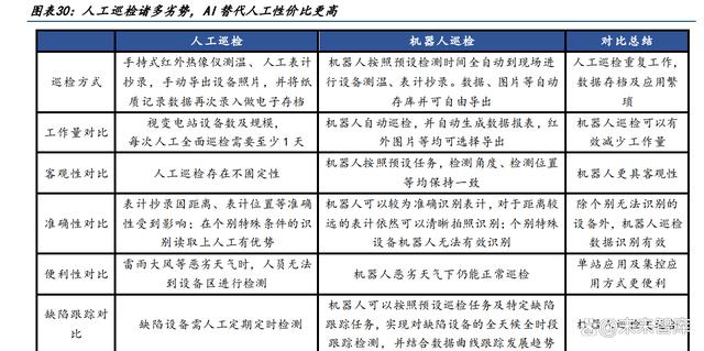 人工巡檢諸多劣勢,AI 替代是大勢所趨。電力行業(yè)有大量巡檢工作條件惡劣,傳統(tǒng)人工 巡檢的工作難度大、危險指數(shù)高、及時性低、工作量大;采用智能巡檢,既具有人工巡檢 的靈活性和智能性,同時響應更加及時、效率更高、成本更低,隨著技術的發(fā)展,智能機 器人技術具有廣闊的應用前景,未來電氣行業(yè)無人化巡檢將成為行業(yè)常態(tài)。 AI 替代人工性價比更高。以 500kv 變電站為例,人工巡檢模式下需要 4 個工人耗費一個 禮拜的工時才能進行一次全面檢查,假設每位工人年薪約 8 萬,而同樣的工作量,一臺巡 檢機器人能在更短的時間內(nèi)完成,其平均成本為 65 萬/臺,計提折舊后約 16 萬/年,使 用巡檢機器人比人工巡檢能節(jié)約 16 萬/年。