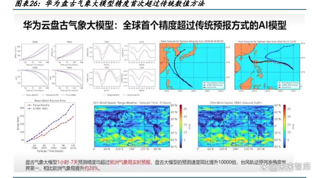 華為盤古氣象大模型精度首次超過傳統(tǒng)數(shù)值方法,速度提升 10000 倍以上。華為云發(fā)布 的盤古氣象大模型 1 小時-7 天預測精度均高于傳統(tǒng)數(shù)值方法,同時預測速度提升 10000 倍,能夠提供秒級的全球氣象預報(傳統(tǒng)數(shù)值預測方法無法做到),包括位勢、濕度、風 速、溫度、海平面氣壓等。同時,盤古氣象大模型在一張 V100 顯卡上,只需要 1.4 秒就 能完成 24 小時的全球氣象預報。