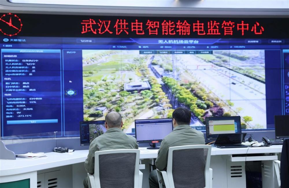 10月23日,武漢漢口江灘,一架白色的無人機(jī)在高空穿梭,機(jī)頭對準(zhǔn)濱江區(qū)內(nèi)的國家電網(wǎng)線路來回進(jìn)行掃描、拍攝。與此同時(shí),距離巡檢現(xiàn)場數(shù)公里外的國網(wǎng)武漢供電公司的巨型屏幕上,無人機(jī)的超高清畫面即時(shí)顯示。