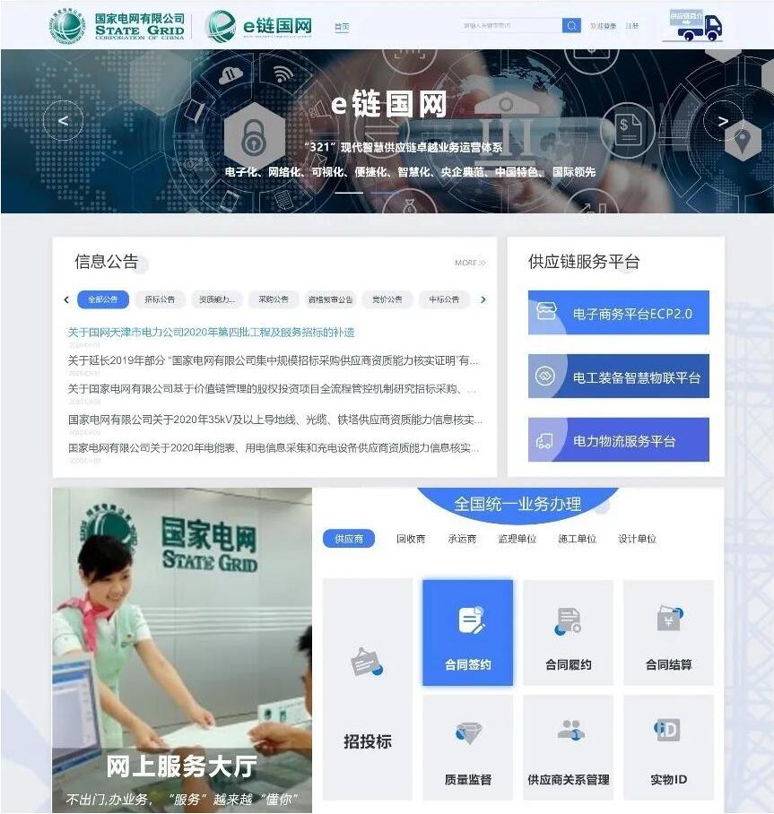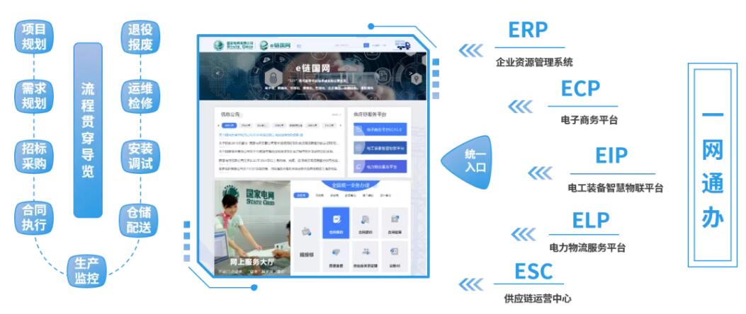 “e鏈國(guó)網(wǎng)”一站式服務(wù)門戶構(gòu)建現(xiàn)代智慧供應(yīng)鏈業(yè)務(wù)體系統(tǒng)一的PC前端窗口,以新一代電子商務(wù)平臺(tái)ECP2.0、企業(yè)資源系統(tǒng)ERP、電工裝備智慧物聯(lián)平臺(tái)EIP、電力物流服務(wù)平臺(tái)ELP、供應(yīng)鏈運(yùn)營(yíng)中心ESC等核心系統(tǒng)作為底層業(yè)務(wù)支撐,向內(nèi)外部用戶提供供應(yīng)鏈相關(guān)的業(yè)務(wù)流程和信息服務(wù),提升對(duì)內(nèi)部用戶、供應(yīng)鏈伙伴的服務(wù)水平。