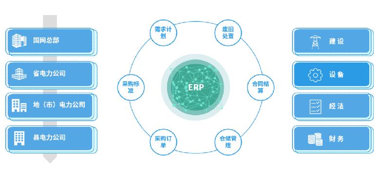 企業(yè)資源管理系統(tǒng)ERP(Enterprise Resource Planning,簡(jiǎn)稱ERP)著力實(shí)現(xiàn)“資源一盤棋”,通過(guò)與ECP、EIP等系統(tǒng)緊密集成,總部、省、市、縣縱向體系貫通,設(shè)備、經(jīng)法、財(cái)務(wù)等橫向?qū)I(yè)協(xié)同,實(shí)現(xiàn)采購(gòu)訂單、庫(kù)存物資、資金結(jié)算等企業(yè)資源統(tǒng)籌管控。該系統(tǒng)主要由計(jì)劃管理、合同管理、倉(cāng)儲(chǔ)管理和廢舊物資處置管理四個(gè)業(yè)務(wù)子模塊組成。