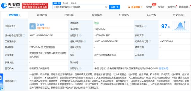 近日,中國大唐集團數(shù)字科技有限公司成立,法定代表人為張德修,注冊資本10億人民幣,經(jīng)營范圍含人工智能行業(yè)應用系統(tǒng)集成服務、人工智能應用軟件開發(fā)、網(wǎng)絡與信息安全軟件開發(fā)、數(shù)字技術(shù)服務、以自有資金從事投資活動等。