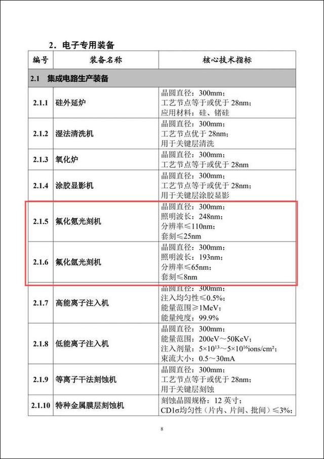 《目錄》中的電子專用裝備目錄下提到,集成電路生產(chǎn)設(shè)備方面包括化氟化氪光刻機(jī),光源248納米,分辨率≤110nm,套刻≤25nm;氟化氬光刻機(jī),光源193納米,分辨率≤65nm,套刻≤8nm。