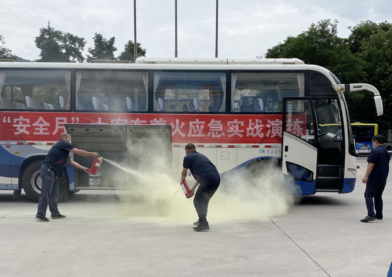在演練時,隨著滿載乘客的大客車行駛至劉電賓館門前,突然行李艙起火,大客車駕駛員在突然遇火險緊急情況下,立即開啟應(yīng)急雙閃燈,靠邊停車,打開車門,迅速引導(dǎo)車內(nèi)乘客有序疏散,并要求大家用濕毛巾捂住口鼻,彎腰依次撤離到車外安全地帶。緊接著滅火組演練人員迅速行動起來,熟練地取出車載滅火器,拔下滅火器安全銷,用噴口對準火源根部,及時將火撲滅,救護組及時疏散和救援下車人員,并對傷員身體狀況進行基本護理和檢查。整個演練過程既緊張,又有條不紊,進一步增強了全體員工的安全意識,真正掌握了交通工具突發(fā)火險后迅速逃生、自救、互救的基本方法,達到了演練的預(yù)期目的。