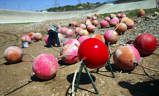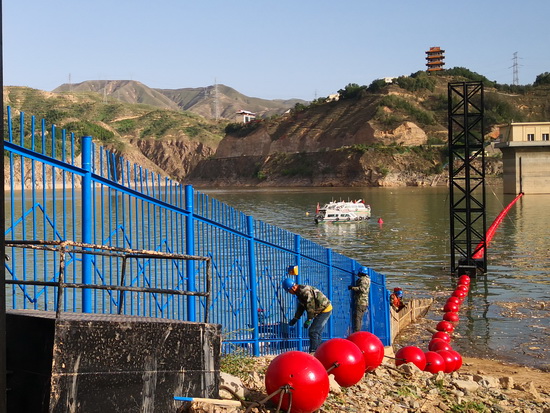 劉家峽水電廠壩前浮球阻攔系統(tǒng)是為防止船舶或人員靠近泄水區(qū)域發(fā)生意外事故而設(shè)置的安全防護設(shè)施和安全標識,主要由浮球、浮箱、滑道、塔架、圍欄及連接鋼絲繩等部件組成。這次維修主要是對2019年汛后檢查中發(fā)現(xiàn)的30個已損壞下沉浮球、連接浮球的繩卡進行維修,對浮箱、鋼塔架和滑道等進行防腐處理以恢復(fù)其功能。