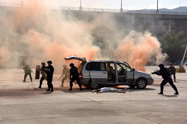 刺耳的警笛響起,縣公安局、縣消防救援大隊、醫(yī)療救援機(jī)構(gòu)車輛疾馳趕往事發(fā)地點(diǎn),3名恐怖分子與武警戰(zhàn)士、防暴警察展開對峙。