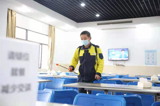 國網(wǎng)重慶璧山供電公司物業(yè)人員對員工食堂進(jìn)行消毒殺菌