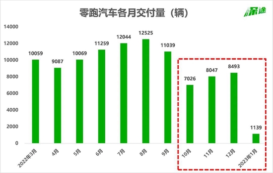 比較讓人意外的是零跑。1月只交付了1139輛,而去年12月是8493輛,環(huán)比下跌幅度達到87%。零跑現在是明顯的后勁不足,去年有連續(xù)5個月交付過萬,從10月開始掉到七八千的水平。1月的成績用“撲街”來形容再合適不過了。