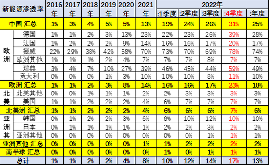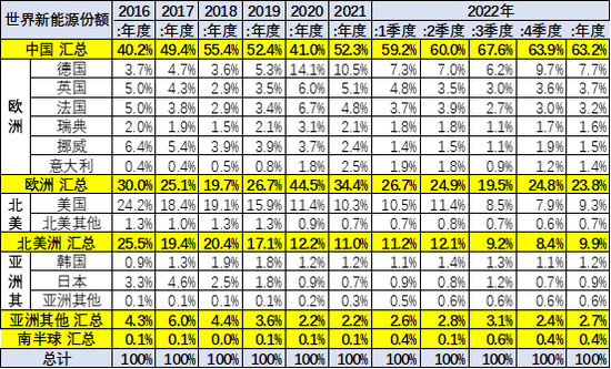 2021年全年的歐洲新能源市場(chǎng)受疫情影響,新能源增長較弱。2022年仍受到疫情影響,歐洲2022年較2021年份額下降較大。近期中國新能源乘用車的增速強(qiáng)于世界平均增長速度,2020年中國新能源乘用車世界份額較大反轉(zhuǎn)。2021年中國全年保持52%,較強(qiáng)。2022年1-12月的中國占世界新能源份額達(dá)到63.2%,其中10-12月的中國占世界份額63.9%。