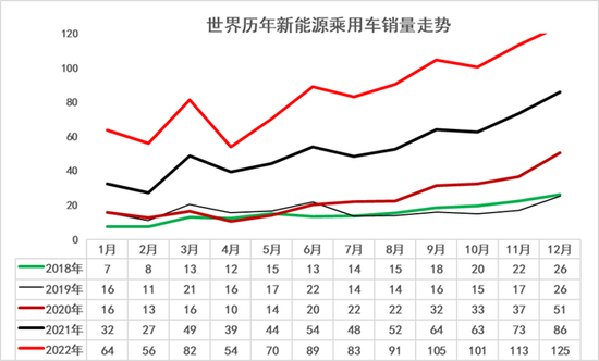 2022年世界新能源車起步較強(qiáng),1-3月基本實(shí)現(xiàn)強(qiáng)勢(shì)高增長,4-5月的新能源走勢(shì)放緩并劇烈下滑,6-12月世界新能源銷量持續(xù)較強(qiáng)增長。