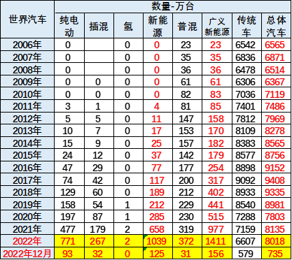 2012年世界廣義新能源汽車158萬臺(tái),到2015年僅有179萬臺(tái),增長緩慢。隨著2016年開始的新能源車加速發(fā)展,廣義新能源車2016年突破200萬臺(tái);2017年達(dá)到317萬臺(tái);2018年突破400萬臺(tái);2020年達(dá)到515萬臺(tái);2021年全年廣義新能源車977萬臺(tái),其中普通混合動(dòng)力達(dá)到319萬臺(tái);2022年1-12月的廣義新能源汽車銷量1411萬臺(tái),其中混合動(dòng)力達(dá)到372萬臺(tái),占比26%。