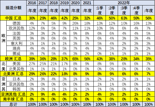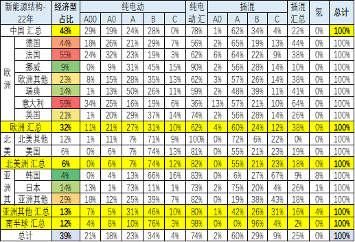 2022年的世界新能源車結(jié)構(gòu)是中國偏純電動(dòng)。歐洲主力國家市場(chǎng)插混較強(qiáng),歐洲市場(chǎng)結(jié)構(gòu)的純電與插混持平的特征明顯,挪威等非汽車生產(chǎn)國家的純電動(dòng)較強(qiáng)。
