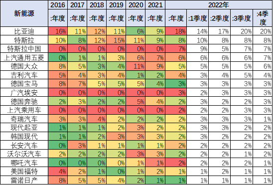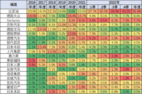 從車企的純電動(dòng)份額來看,比亞迪的份額總體來看持續(xù)上升,從2017-2021年總體保持在7%以上的份額水平,但2022年的份額上升到12%,表現(xiàn)良好。