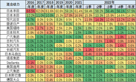 混合動(dòng)力市場(chǎng)是日韓有效的控制,豐田、本田、日產(chǎn)和現(xiàn)代的混動(dòng)表現(xiàn)很強(qiáng),占據(jù)93%。其他大部分企業(yè)的混動(dòng)份額均不超過1%。長城在1季度的混動(dòng)市場(chǎng)份額表現(xiàn)較強(qiáng),也是產(chǎn)品突破的機(jī)遇。