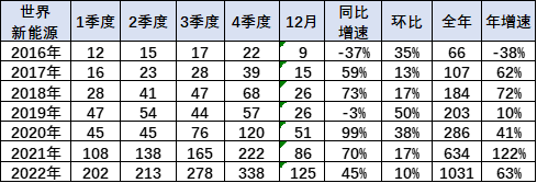 2019年新能源減速趨勢(shì)超預(yù)期。前期連續(xù)幾年世界新能源銷量已經(jīng)超越60%增速。2021年表現(xiàn)較強(qiáng),全年增速回升到122%。2022年銷量增長63%仍很強(qiáng)。
