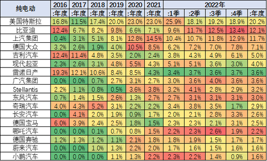 從歷年銷量份額看,特斯拉保持世界第一,目前持續(xù)走強(qiáng)。中國的比亞迪(294.540, -8.08, -2.67%)和上汽集團(tuán)(14.820, -0.14, -0.94%)的新能源表現(xiàn)優(yōu)秀,上汽乘用車和上汽五菱兩家自主車企表現(xiàn)很好。德國大眾的新能源車表現(xiàn)較強(qiáng),2021年受到疫情嚴(yán)重影響,加之去年年末沖刺,年初走勢(shì)偏弱。寶馬集團(tuán)、德國奔馳等保持在第二梯隊(duì)水平。