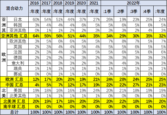 中國近兩年混動(dòng)高速發(fā)展,2022年成為世界較大的混動(dòng)市場(chǎng),超越美國成為超強(qiáng)主力。