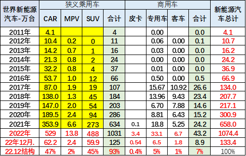 從上面數(shù)據(jù)看,專用車和客車只有中國市場(chǎng)比較強(qiáng),世界其它市場(chǎng)銷量微乎其微,因此暫不分析世界商用車,世界新能源汽車主要專指新能源乘用車。今年1-12月新能源乘用車銷量1031萬臺(tái),商用車銷量43.2萬臺(tái),未來世界電動(dòng)皮卡的銷量是我們關(guān)注重點(diǎn)。