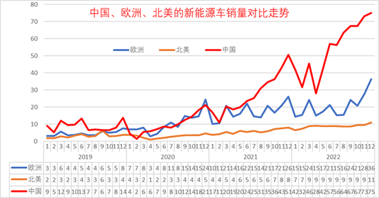 根據(jù)全國乘聯(lián)會(huì)數(shù)據(jù):中國2022年1-12月的銷量649萬臺(tái),大幅超越歐洲的247萬和北美洲的103萬的銷量,中國新能源車優(yōu)勢(shì)明顯。