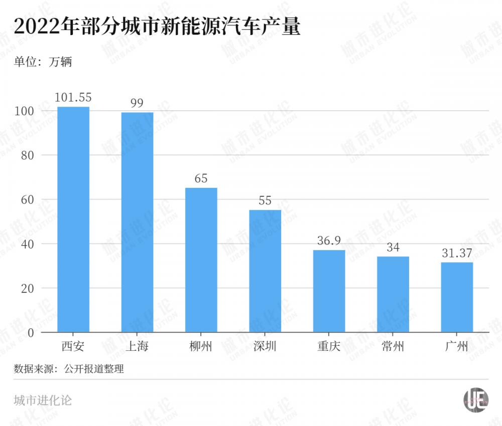 依托新能源汽車強(qiáng)勁支撐,西安一舉跨入“百萬(wàn)輛陣營(yíng)”。更為重要的是,西安憑借著新能源汽車驚人的增速一舉完成對(duì)上海(99萬(wàn)輛)、柳州(65萬(wàn)輛)的反超,成功登頂新能源汽車產(chǎn)量第一城。